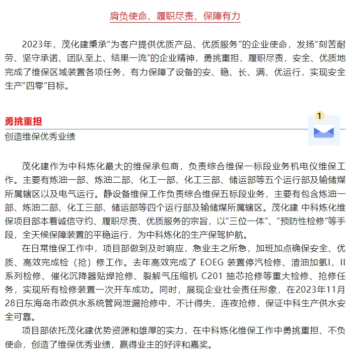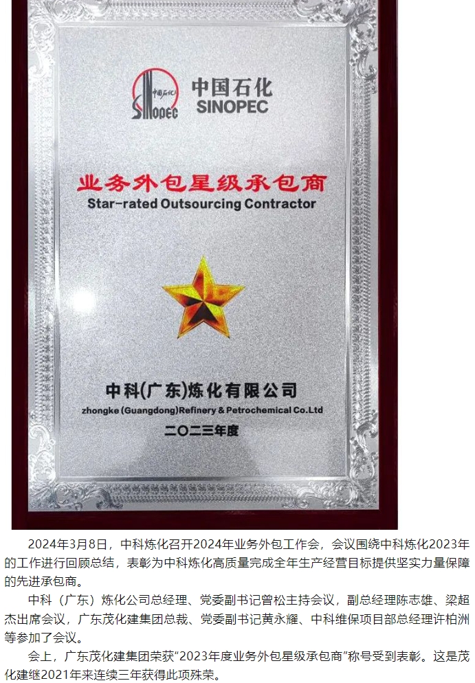 喜報:榮獲中科煉化“2023年度業(yè)務(wù)外包星級承包商”稱號
